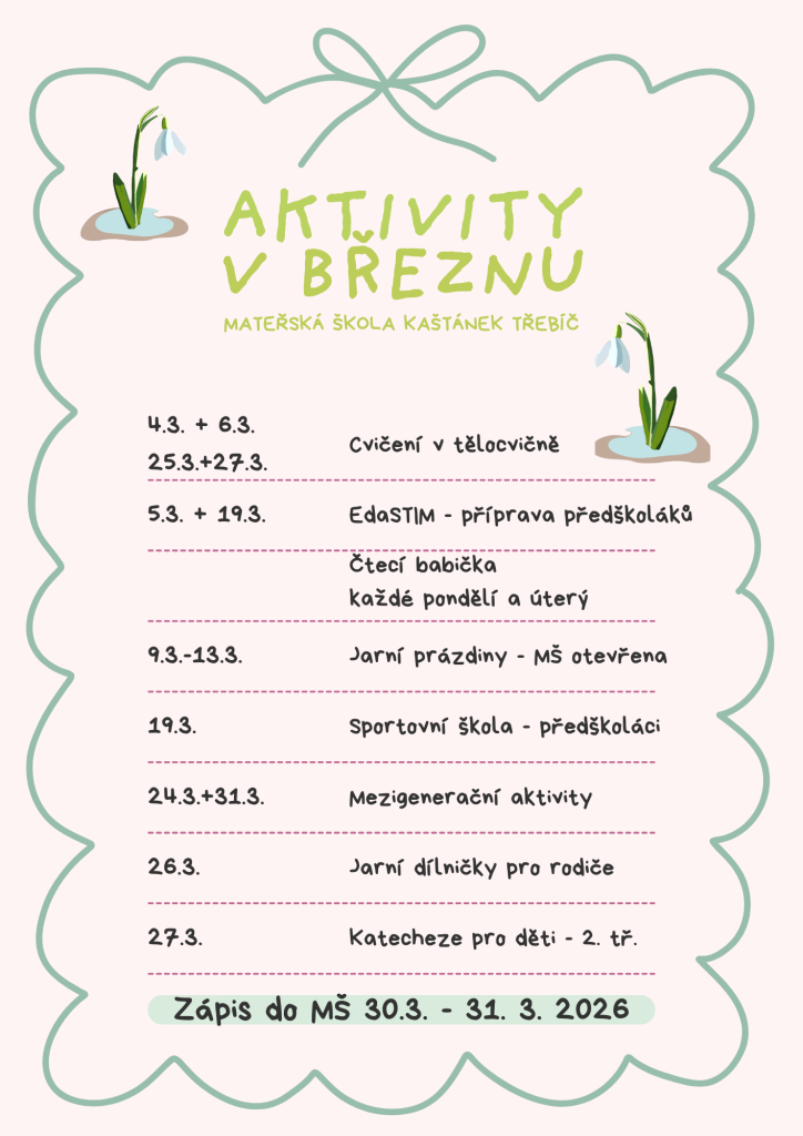 Cvičení v tělocvičně každou středu a pátek. 5. 3.+19. 3. EdasTim – příprava předškoláků. 19. 3. Sportovní škola. 24. 3. +31.3. Mezigenerační aktivity. 26. 3. Jarní dílničky. 27.3. Katecheze pro děti.